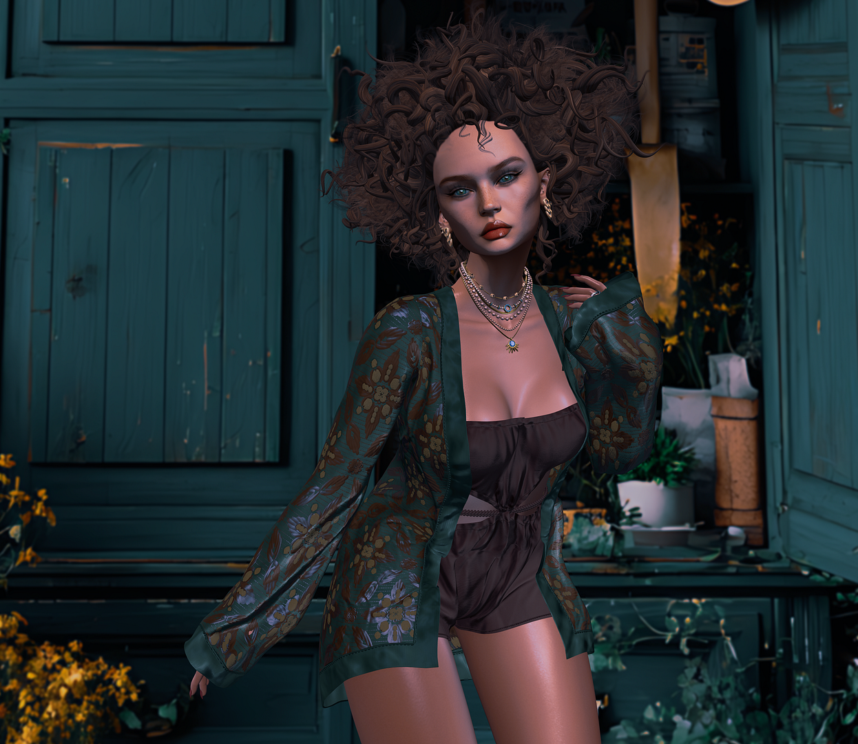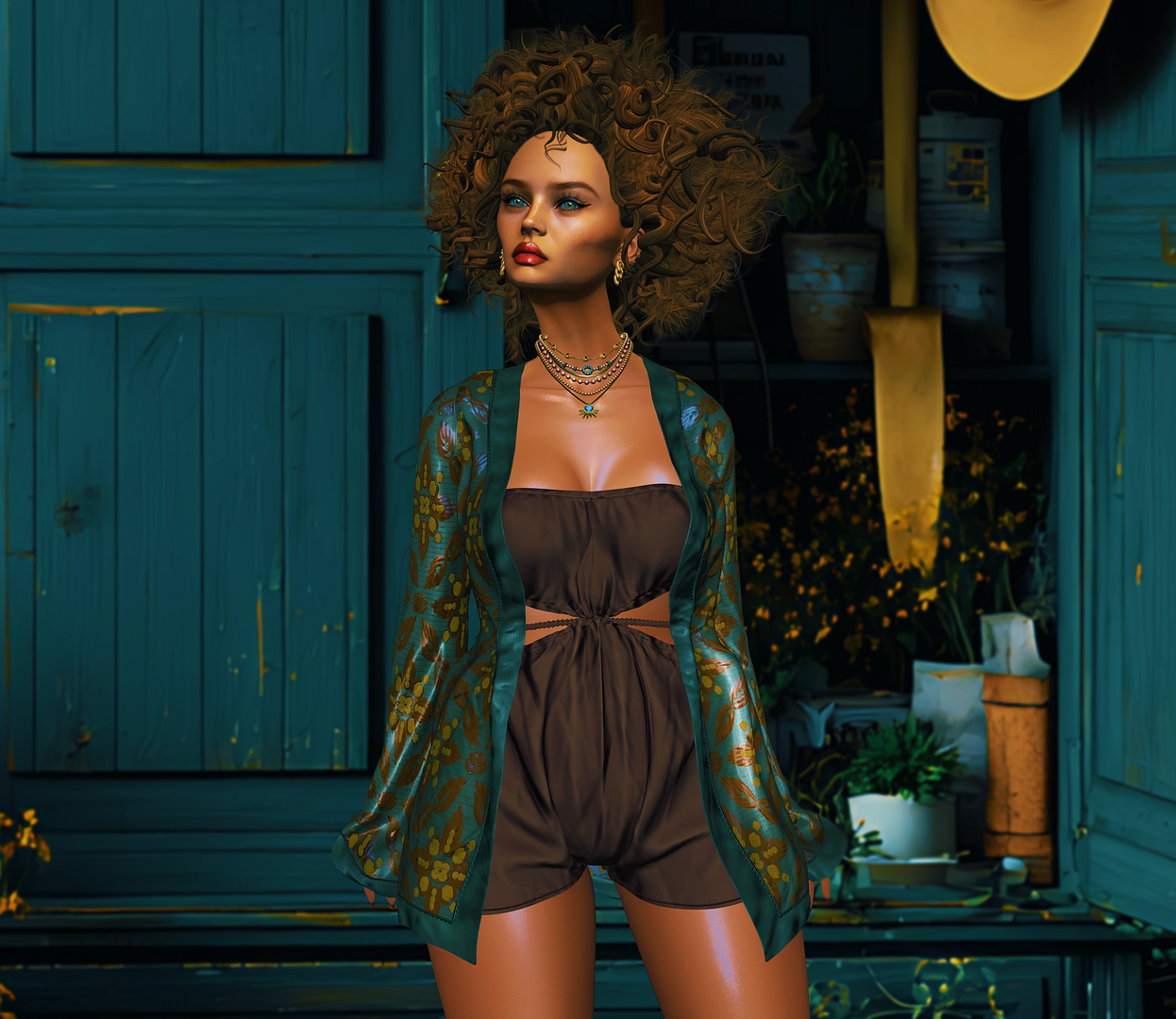 outfit: fd-Boho Romper-cocoa/ Metallic Kimono -Olive