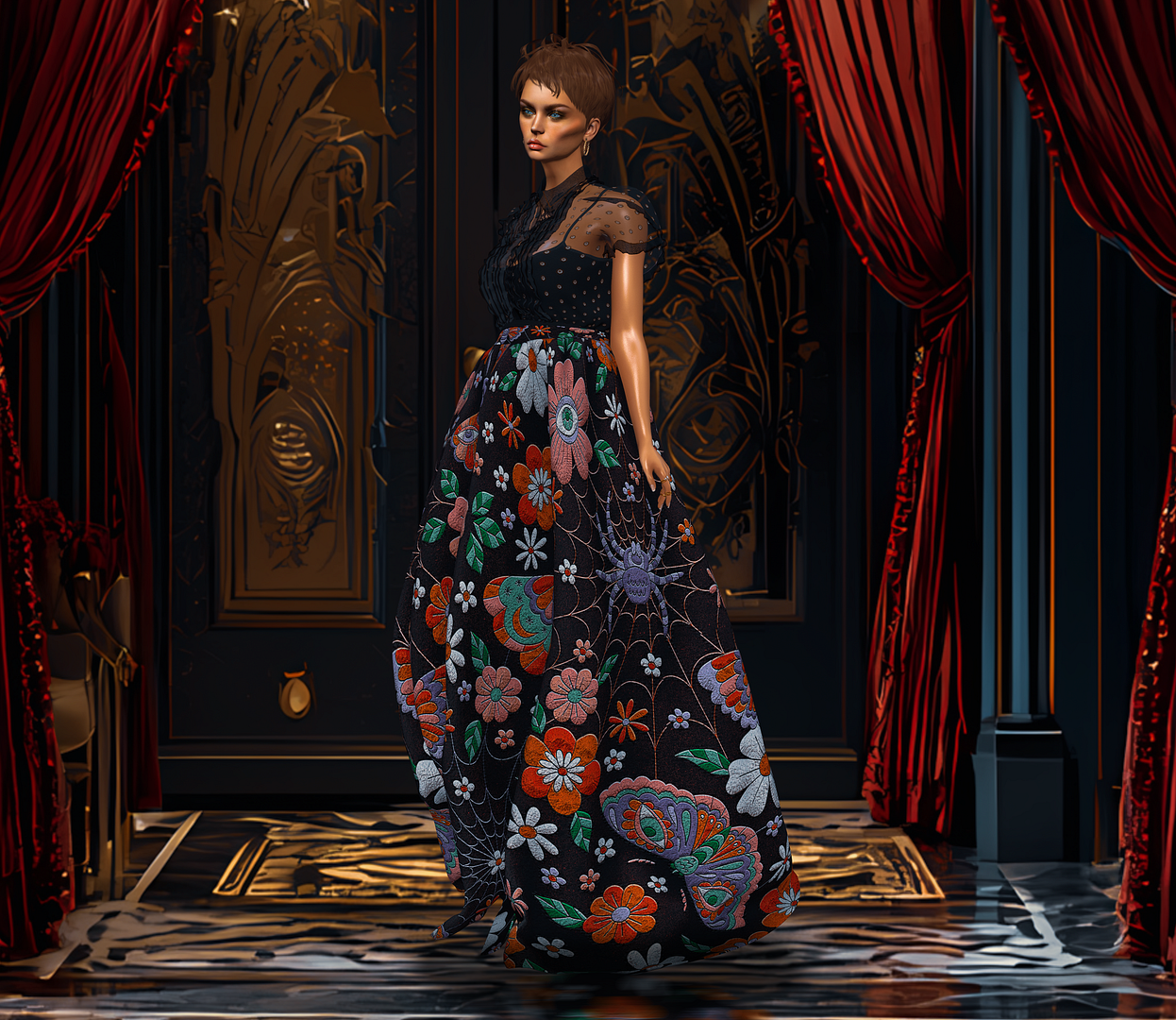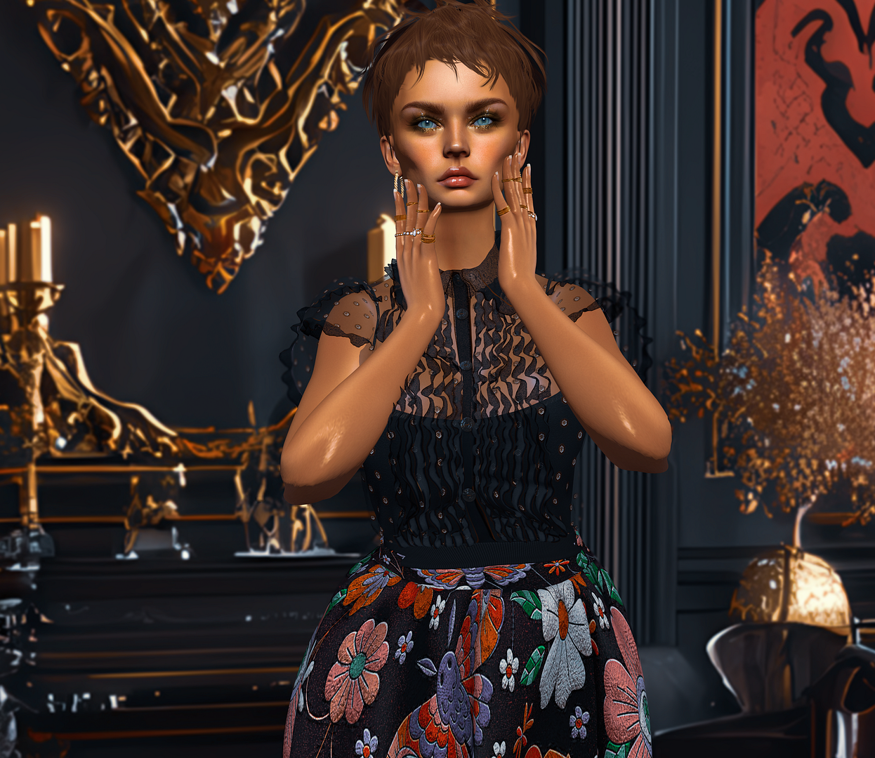 To complete the look, the styling leans into a beautifully effortless kind of decadence. The Shifuku “Sheer Dot Blouse” floats delicately, its airy texture offering a soft contrast to the richness of the scene, while the “Hippy Groovy Maxi-skirt” brings movement with every step. It’s a pairing that feels both relaxed and luxurious—an unexpected harmony that works flawlessly. Accented with the Black Lotus “Amore Rings”, each gesture becomes a statement, subtle yet striking, and the Yummy “Hoop Set” Earrings frame the face with a touch of classic elegance. Altogether, this look feels like a perfect balance of opulence and ease—rich, decadent, and undeniably beautiful in every sense.