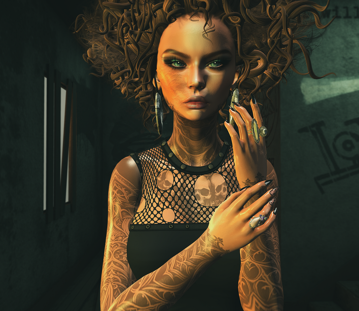skin: a.b – Alexa – Rose Kiss – MED BROWS vanity: {dm} . SS – Spiced Latte/ Cat Liner . Black 75%/ Le Forme– Bento Nails Fancy 001 outfit: Rowne.- Ziv Soft Cardi – Olive/ Rowne.- Ziv Soft Joggers – Olive accessories: AZOURY – Lysith Headwear & neckpiece Brown backdrop: SATO- Mistic Dreams@ Black Fair