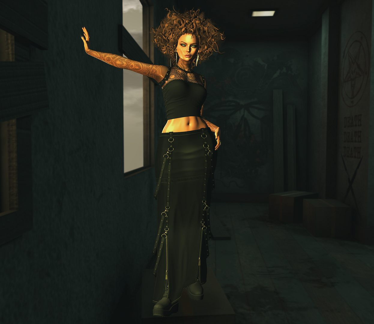 To start this semi-punk macabre look, we’re throwing out huge thanks to NO_MATCH for the “Nightshade” hair, adding a touch of edgy, mysterious flair. Pair that with the deadly combination of the ROWNE “Bex” Denim Bodysuit and the “Vertz” Denim Mini for a look that’s both bold and playful. And of course, don’t forget the DAZZLING “Jade” Combat Boots to add that perfect pop of edgy style. Oh, the bat balloons? Have to give MOVEMENT a hugs shout-out too! Its the perfect accessory for the vibe!