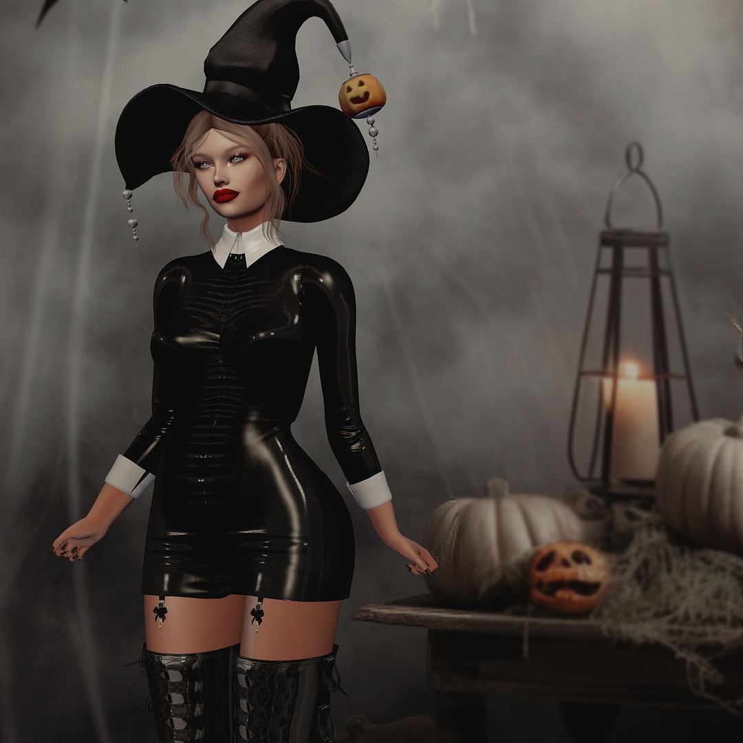 Now, let’s talk style! Check out this incredible latex “Wednesday” dress from S&P—it hugs every curve just right! Pair it with the stunning Madame Noir “Night Boots” and Doe’s “Dark Room” hair and hat, and don’t forget to hop on that “Witch Broom” from Static Posture.