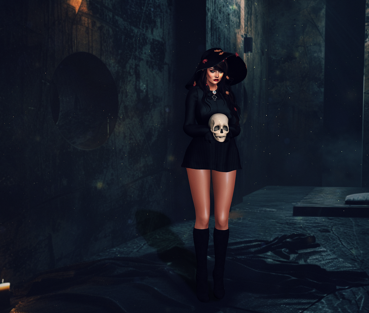 With the thunderstorm rumbling outside and the atmospheric “Dark Locked Room” setting the scene, this gothic ensemble truly comes to life. The combination of the MUG dress, DOE hair and hat, and BAX COEN boots creates a look that’s both haunting and elegant. It’s a celebration of all things spooky and stylish, showcasing how the right backdrop and accessories can elevate a display to new heights.