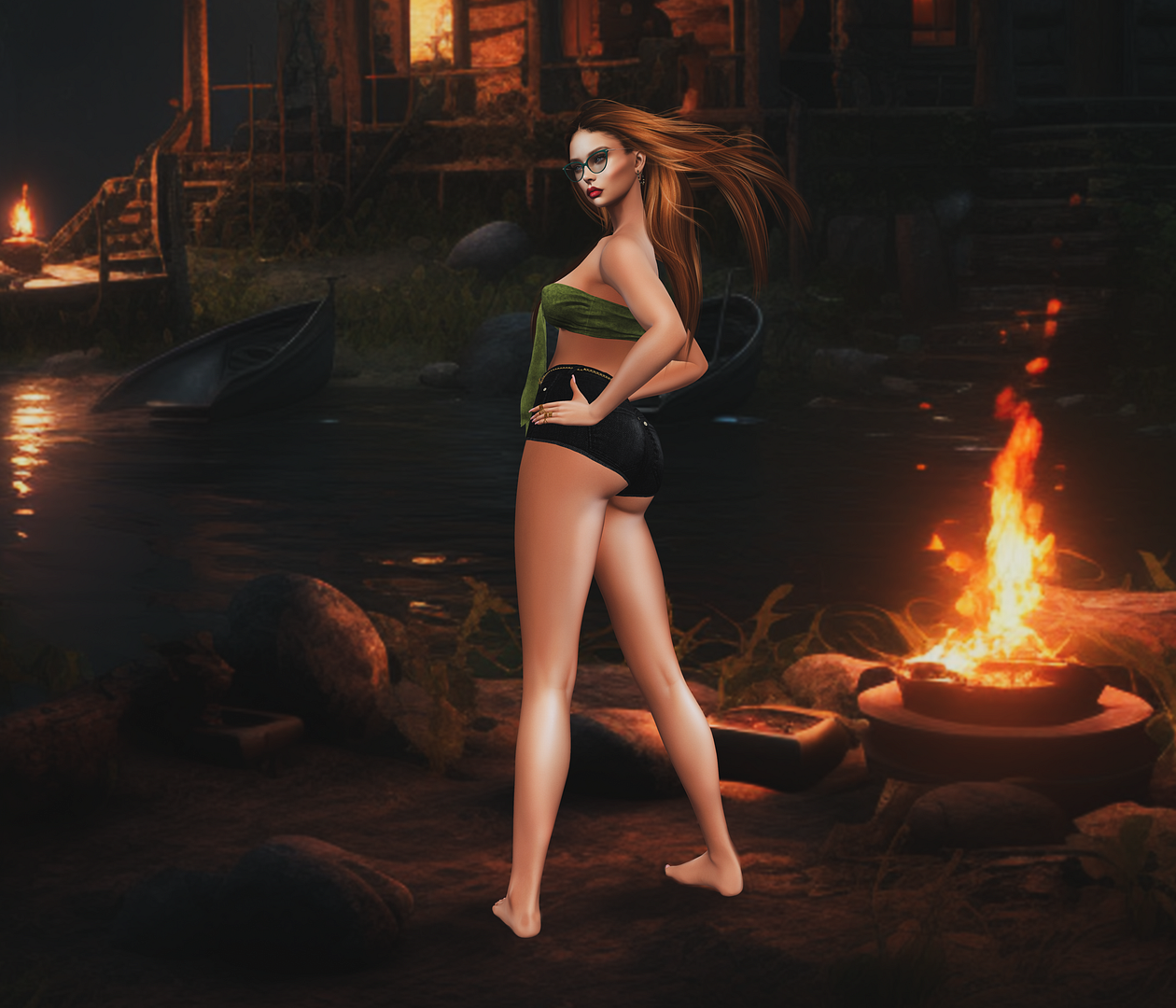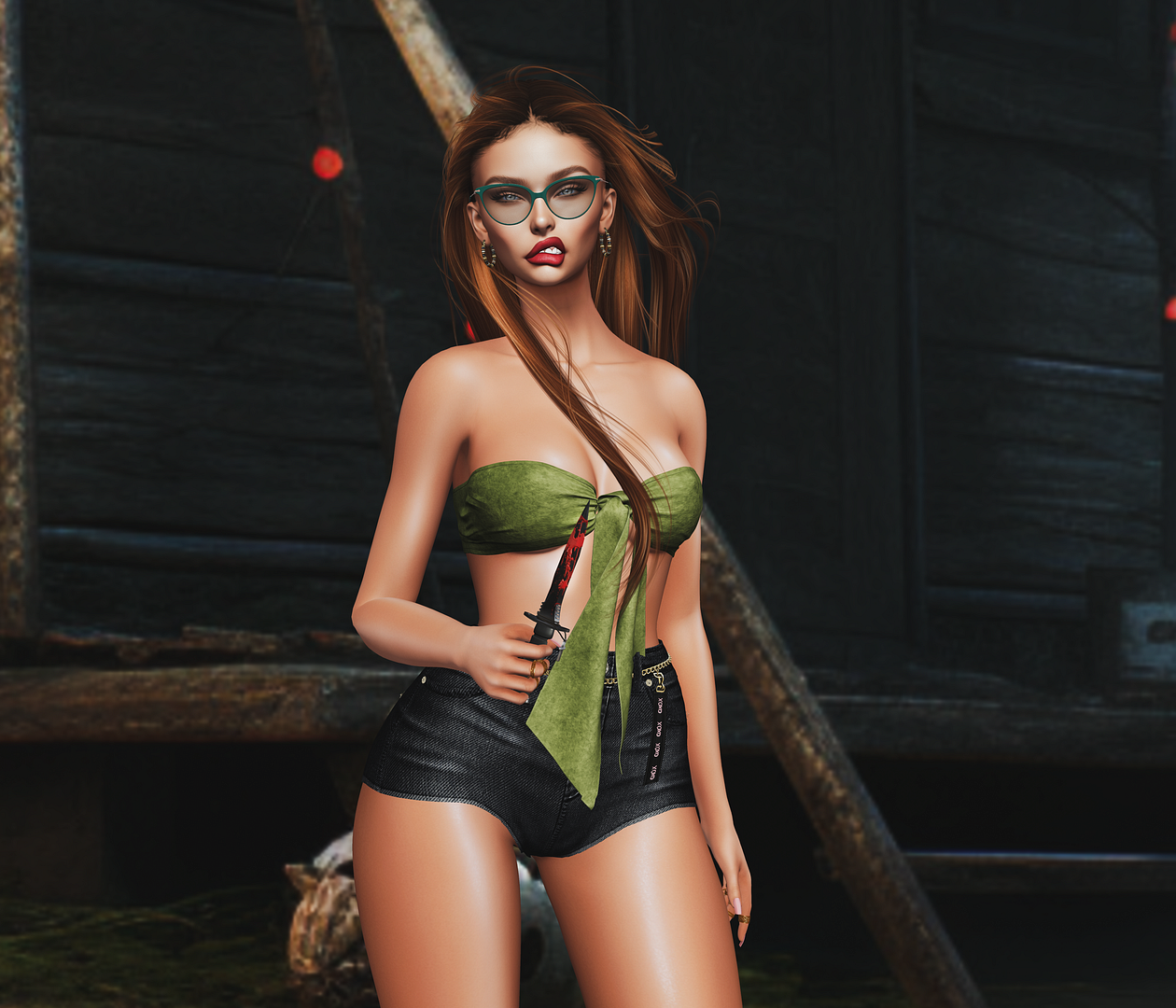 skin: tres beau – cameron skin (2.4) hair: DOUX – Ryder Hairstyle accessory: GRAAL STORE – EVA KNIFE jewelry: EarthStones– Whitney Hoop Earring – Tiger Stripes/ [BL] Gia rings outfit: CALITHEA . Marietta . Top/ Shorts – Green backdrop: SATO– Friday the 13th