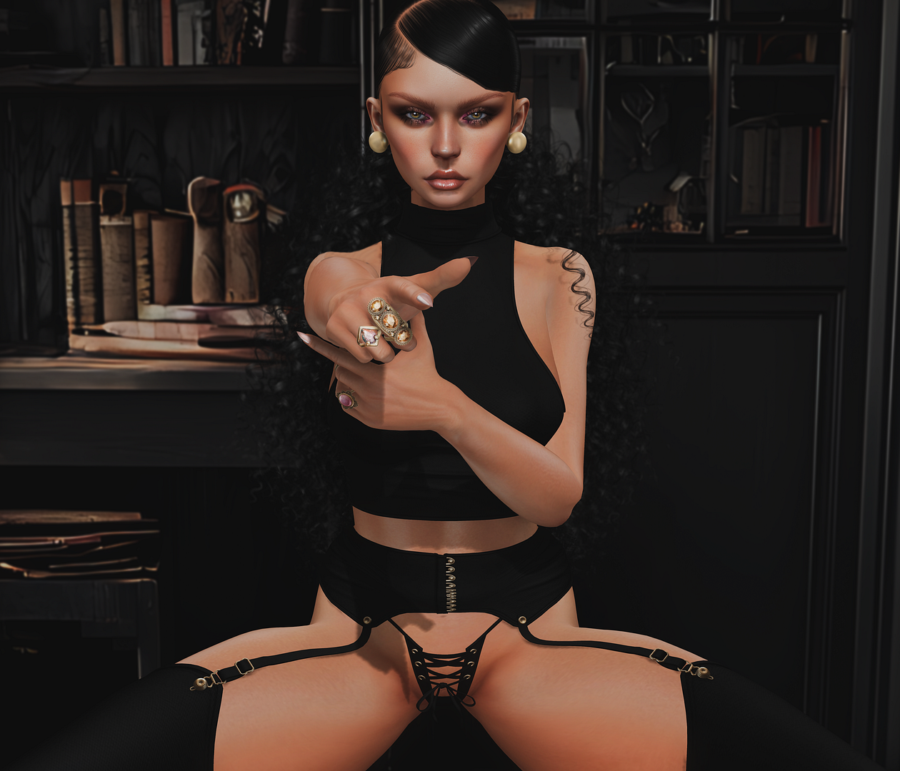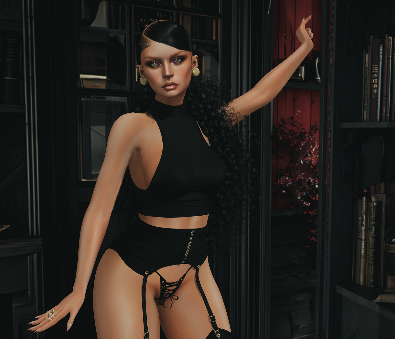 skin: a.b – Alexa – Rose Kiss – MED BROWS vanity: ALBA – Amour Eyeliner/ HER – SHANE HAIRBASE – BROWN 11 jewelry: La Plume– Le Matou outfit: Shi-Leather- Black metal / [RED GIRL] Ami Top & Pants Black Velvet backdrop: SATO– Abandoned Interior