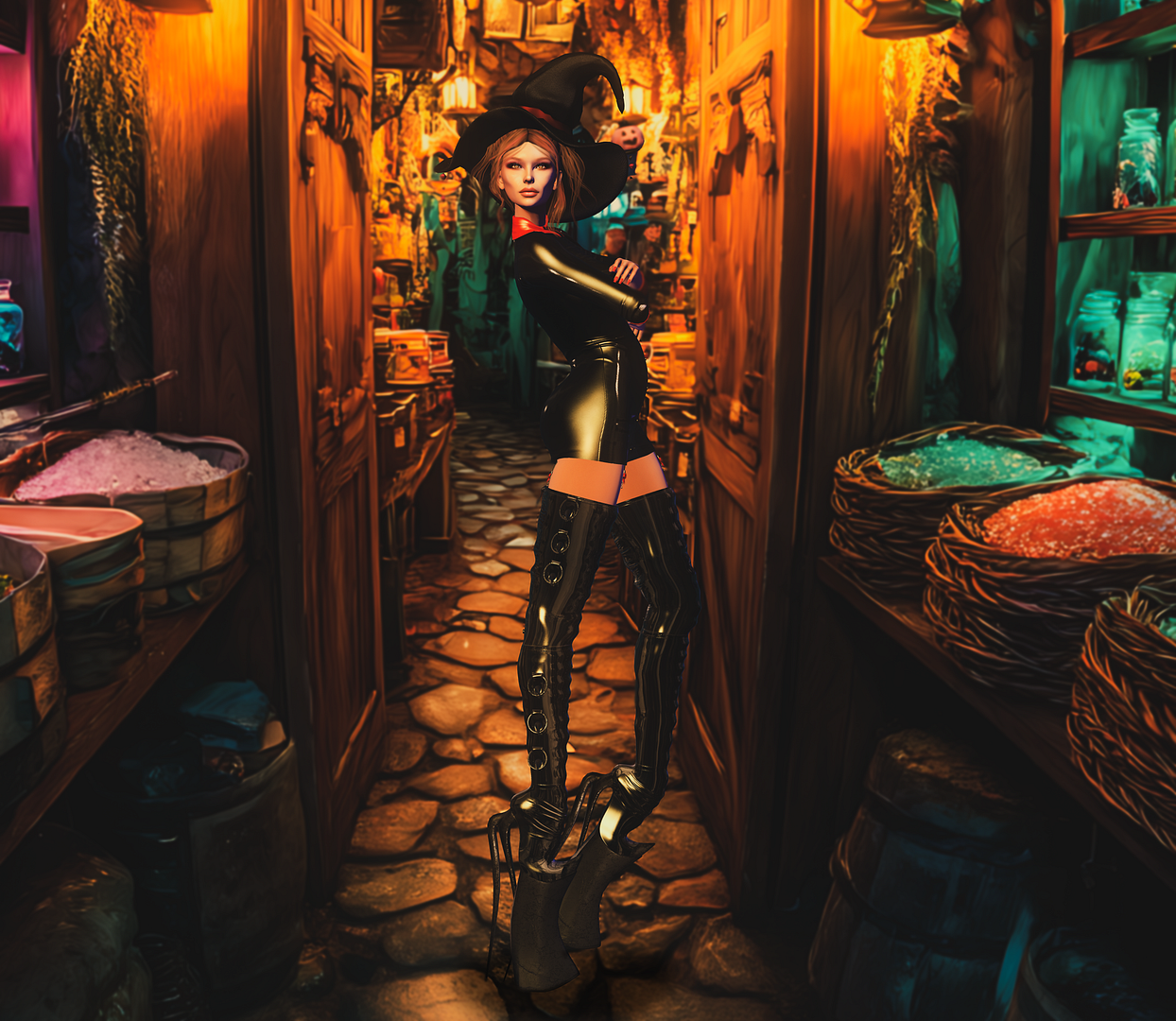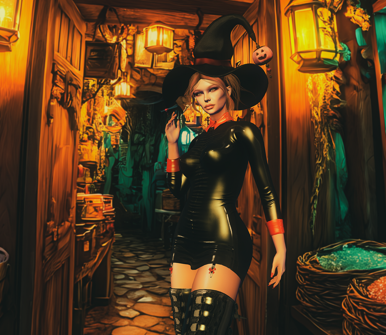 Now, let’s talk style! Check out this incredible latex “Wednesday” dress from S&P—it hugs every curve just right! Pair it with the stunning Madame Noir “Night Boots” and Doe’s “Dark Room” hair and hat, and don’t forget to hop on that “Witch Broom” from Static Posture.
