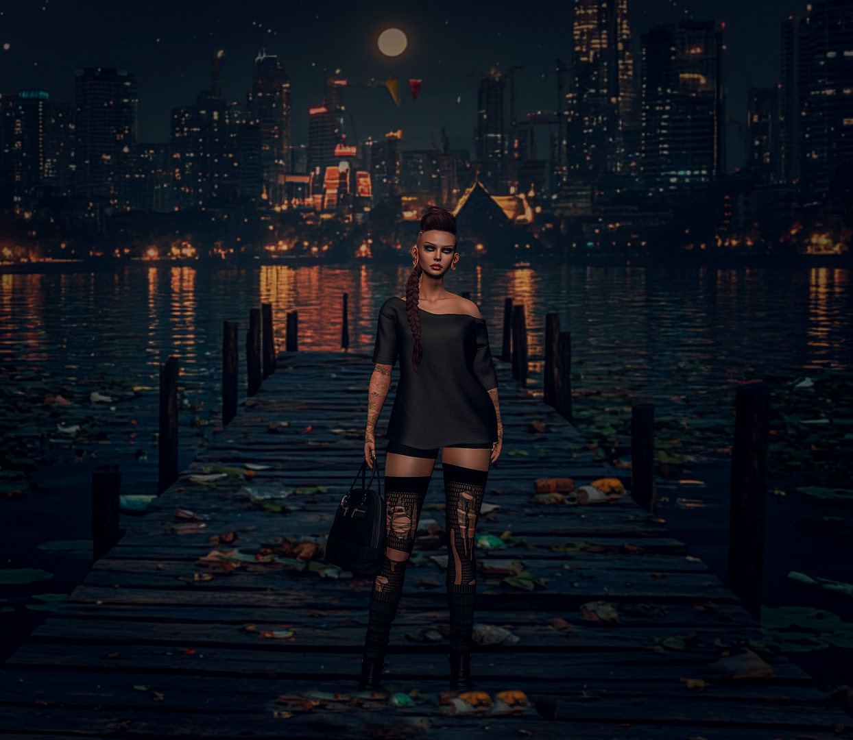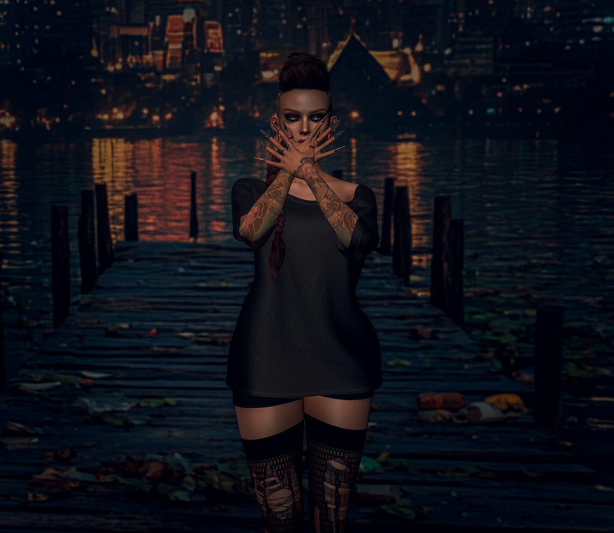 Now, onto this post! I couldn’t resist diving into the edgier side of fashion while shining a light on that powerful (and yes, a bit grimy) “Dirty Pier” backdrop. I started with THE SKINNERY‘s “Taylor” skin, added some smudgy glam with MILANI’s “COPAS” eyeshadow, and while it looked gorgeous, I wanted to amp up the attitude. So, I threw on NO_MATCH’s “NO BAN” hair, REDGIRL’s “Offshoulder Tee” and “Rhys Boxers,” and topped it off with PURE POISON’s sparkly “Ballerina” nails and rings. The sparkle on those nails? Absolute perfection. And let’s not forget the tattoo—I’m obsessed with VEGAS TATTOO’s “The Seed” tattoo—it’s just edgy enough to make me feel tough but soft enough to wear with anything.