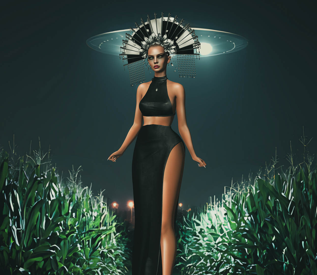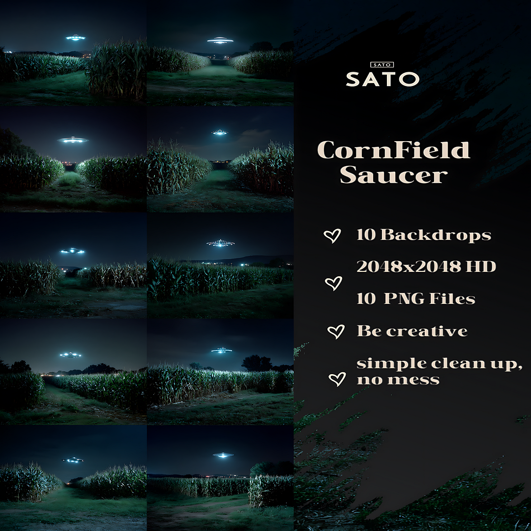 Step right up, stargazers and fashion voyagers! SATO’s “Cornfield Saucer” backdrop is here to whisk you straight into an intergalactic runway — where eerie lights dance across golden stalks, and mysterious saucers hover like curious guests at a cosmic fashion show. Who knew a cornfield could feel this fabulous?