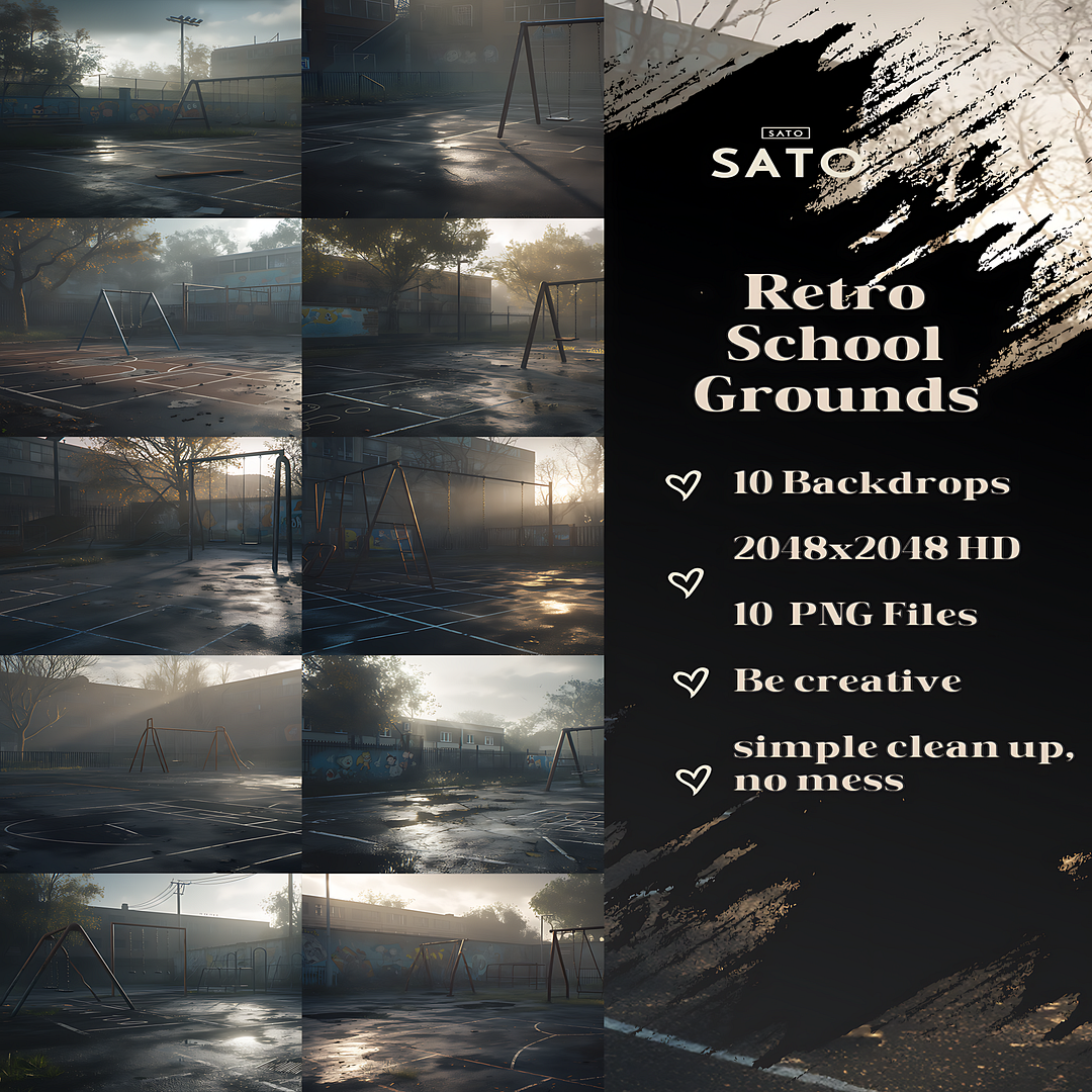 The moment you step in front SATO’s “Retro School Grounds” backdrop for the BLUE Event, you’re transported to a scene straight out of a moody French film. Rain-slick and gritty stone glisten under muted sunlight. Long, cinematic shadows move across the courtyard and there is a hush in the air — the kind of stillness that feels heavy yet comforting — as if the swings themselves have absorbed decades of whispered secrets and unspoken dreams.