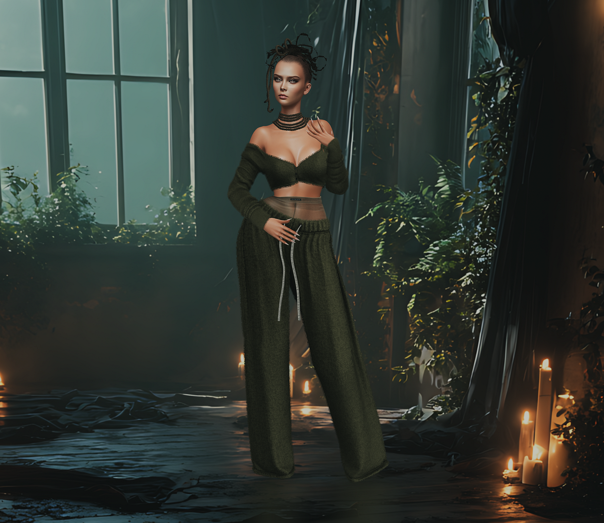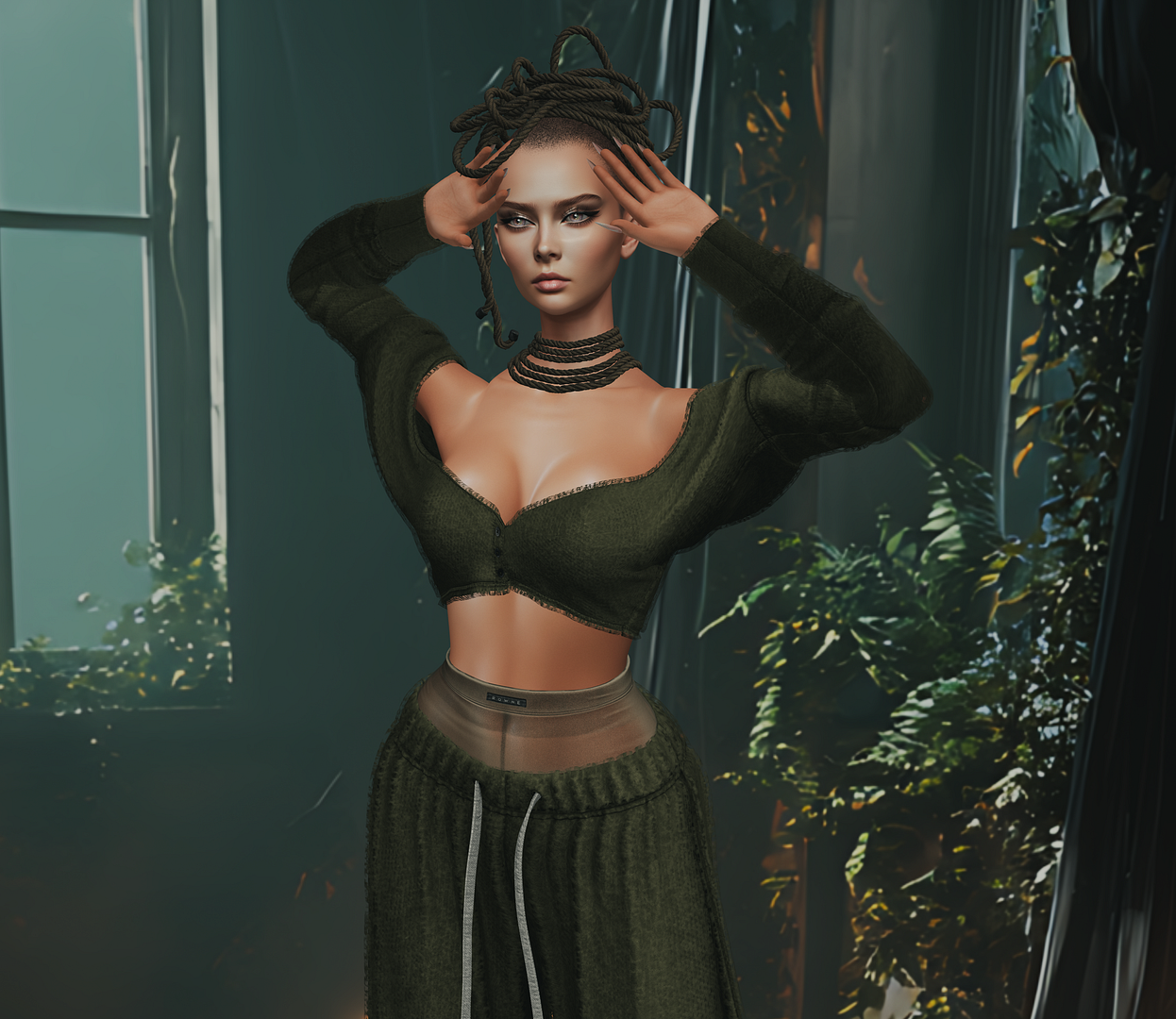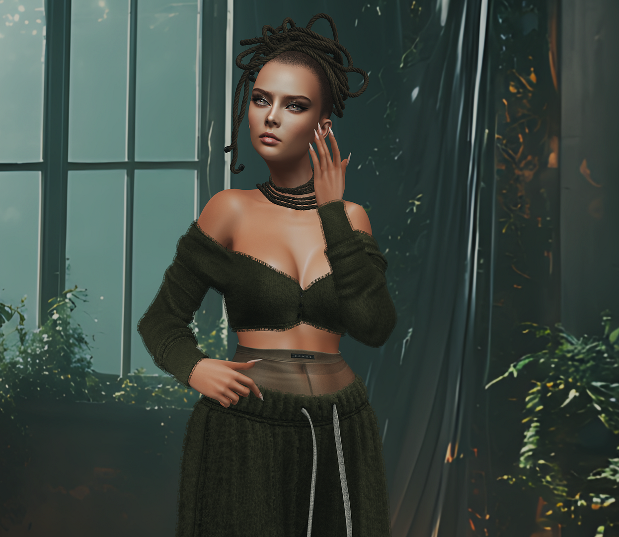 skin: a.b – Alexa – Rose Kiss – MED BROWS vanity: {dm} . SS – Spiced Latte/ Cat Liner . Black 75%/ Le Forme– Bento Nails Fancy 001 outfit: Rowne.- Ziv Soft Cardi – Olive/ Rowne.- Ziv Soft Joggers – Olive accessories: AZOURY – Lysith Headwear & neckpiece Brown backdrop: SATO- Mistic Dreams@ Black Fair