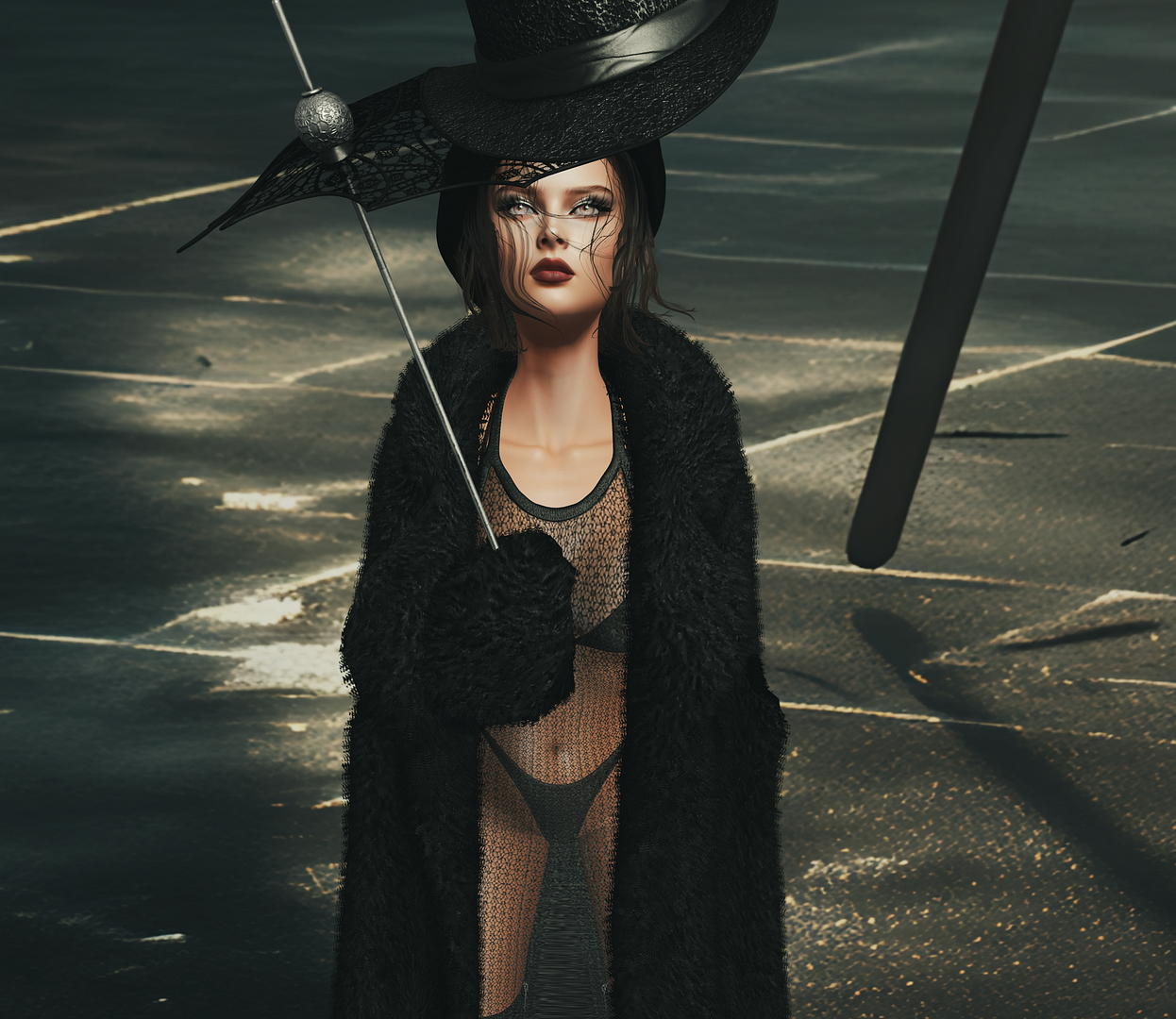 You see, the backdrop doesn’t just sit behind you; it frames you, enfolds you, and gives your story a setting rich with depth and mystery. Despite its melancholic undertones, there’s an undeniable warmth. Where else can you find a use for AZOURY and their “Velitor” umbrella/hat combo? It works perfectly with .SHI and the “Altira” hair! I swear, pass me a cigarette and a tea right now!