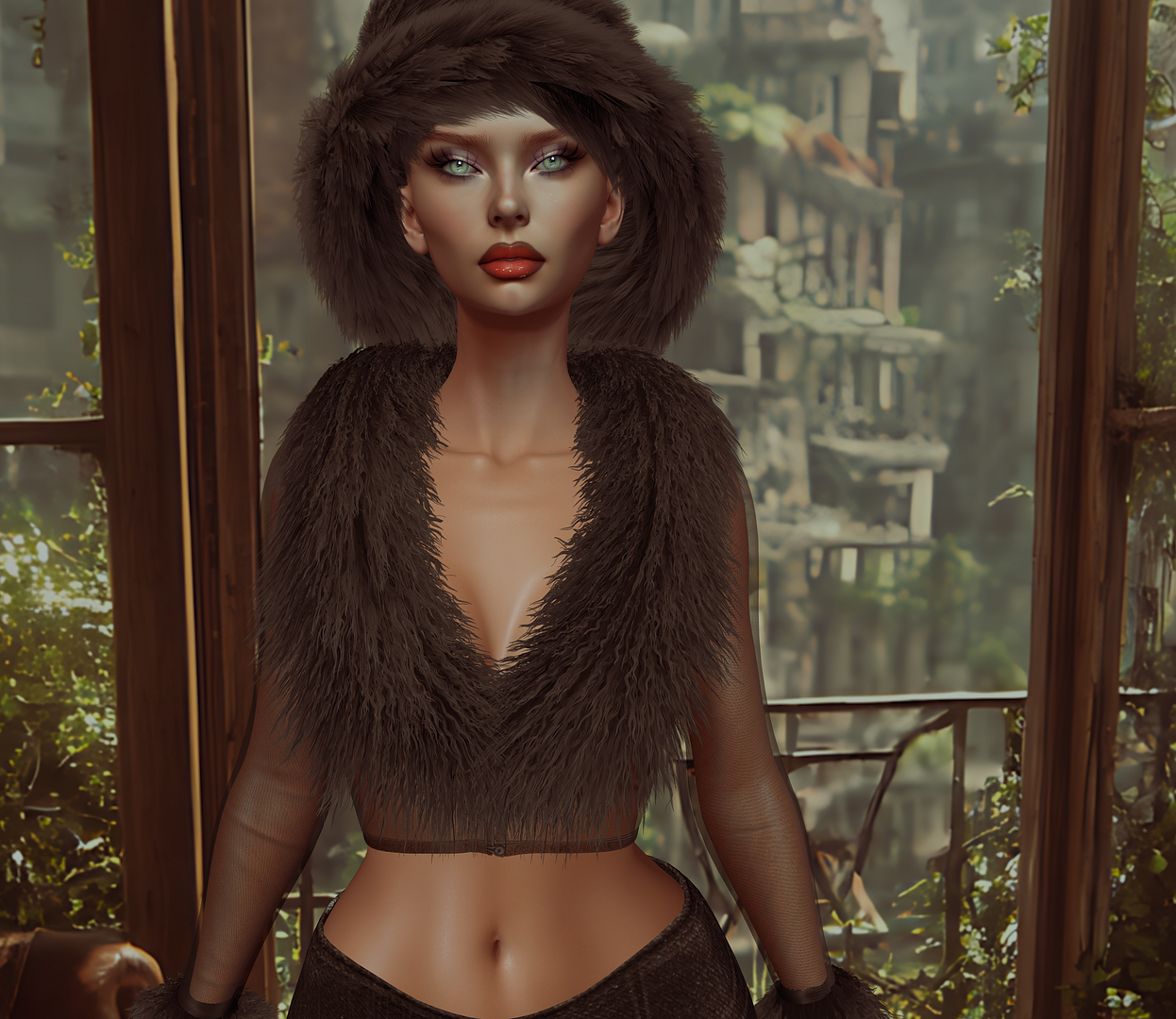 skin: a.b – Alexa – Rose Kiss head: Lelutka– AVALON hair: .Shi Hair : Altira vanity: {dm} . SS – Gun Metal/ Cat Liner . Black 75% outfit: Jeune by Rowne– Lila Net Dress – Onyx/Kheops– VESNA – FUR COAT – Black accessory: AZOURY– Velitor {Metal Silver}/Rowne– Emina Bikini Top – Brown Poses: old Slouch Poses backdrop: SATO- Retro School Grounds@ BLUE EVENT