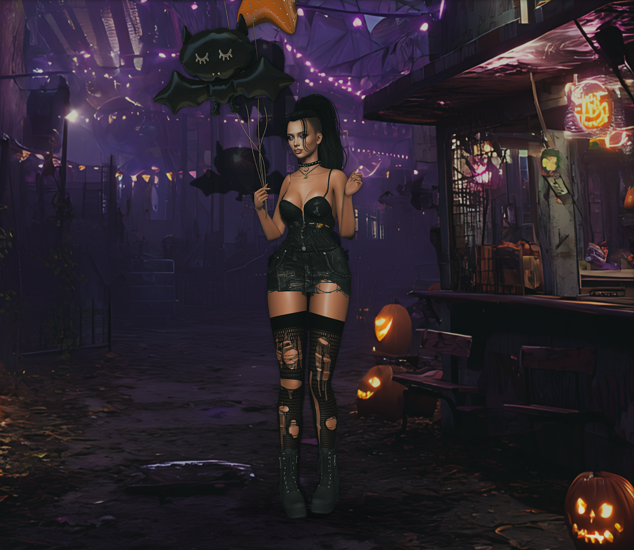 To start this semi-punk macabre look, we’re throwing out huge thanks to NO_MATCH for the “Nightshade” hair, adding a touch of edgy, mysterious flair. Pair that with the deadly combination of the ROWNE “Bex” Denim Bodysuit and the “Vertz” Denim Mini for a look that’s both bold and playful. And of course, don’t forget the DAZZLING “Jade” Combat Boots to add that perfect pop of edgy style. Oh, the bat balloons? Have to give MOVEMENT a hugs shout-out too! Its the perfect accessory for the vibe!