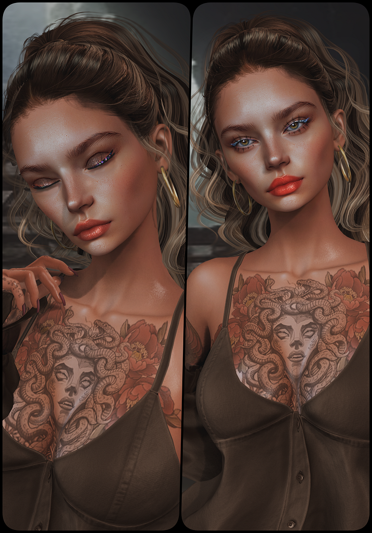 The “F728” hair from TRAM is the perfect funky, mussy, bedhead sexy hair that we would expect from such an amazing creator and the perfect topper to this ensemble and the tattoo is older and has no distinct name, it literally just says “tattoo” in my inventory so if anyone can guess it and let me know, I would love to go back for more and thank you!